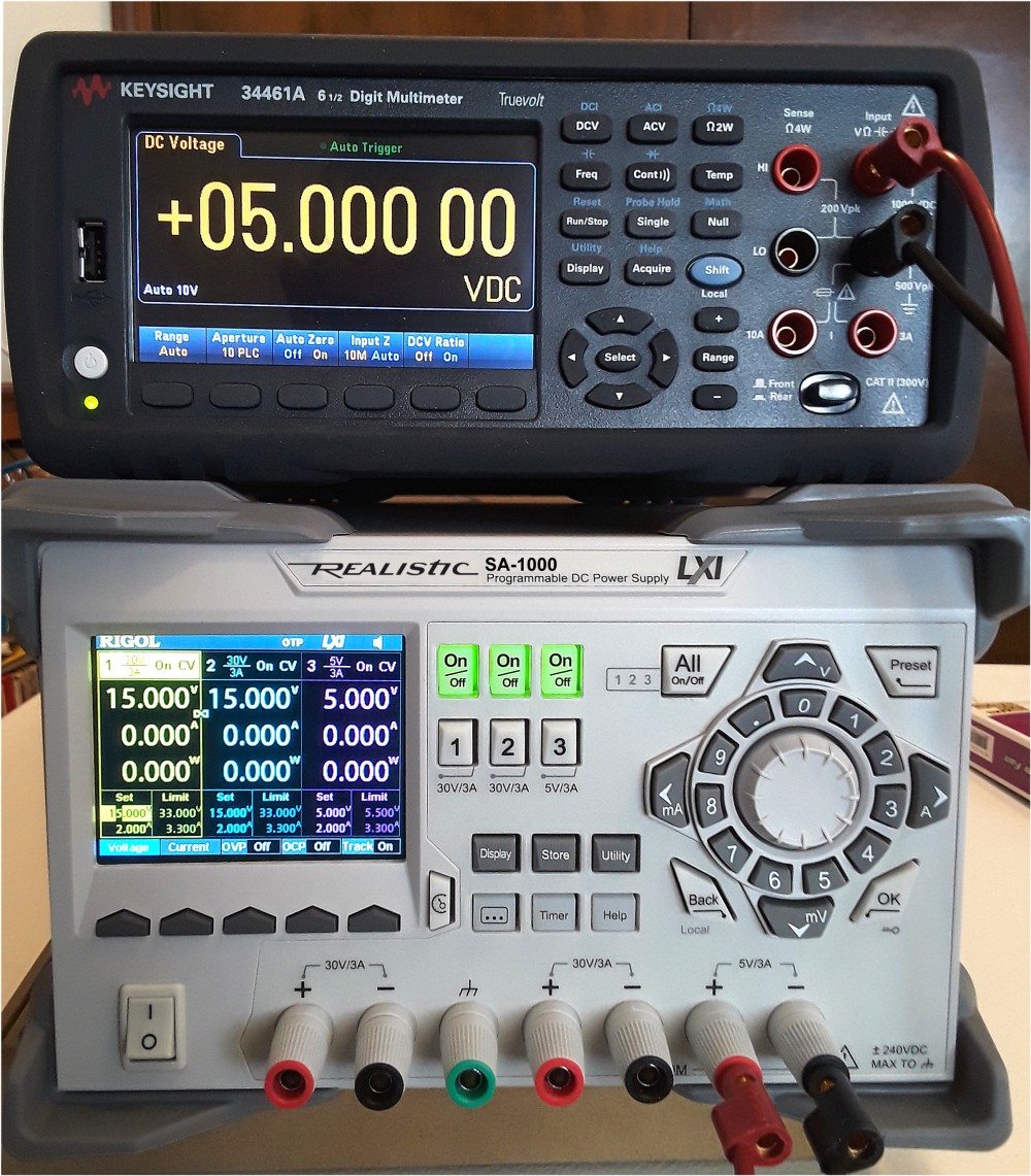 This software is based on the DP832 SCPI Calibration Guide published by TooOldForThis on EEVblog. It's a turn-key solution that runs under Windows 2000-11. It's well-behaved and should also run perfectly in WINE and other Linux Win32 containers. Our software does a FULL calibration of the DP832 channels. It does this by by assessing and analyzing the actual errors that accrue during the regular factory calibration process. These errors are unavoidable due to loopholes in the factory calibration. The errors are then systematically applied to cancel the factory calibration mistakes. How accurate can it get? Most units will achieve RMS error on all three outputs of less than 1.5 mV across the entire output voltage range. The 5 V supply will likely show final errors less than 0.9 mV RMS. (Please note that the DACs in these supplies have monotonicity errors that vary widely from unit-to-unit. Your mileage may vary.) Accuracy Assessment is built in. You can run a statistical assessment of accuracy on any of the DP832 outputs at any time to maintain a permanent record of your unit's performance. What's needed to use the software? * A DP832 power supply connected on a LAN; * A Keysight 34461A (or better) 6 1/2 digit DMM connected on the LAN. * The IP addresses of both instruments (you'll enter them into the software, which will need them to run properly). By downloading this software, you acknowledge and agree to these terms. You also acknowledge the following: * You have the technical skill and understanding for conducting automated calibration of electronic instruments. * You will follow all standard safety procedures while working with the Software. DP832 Calibrator -- Direct download of program executable. The DP832 Calibrator Software runs in a text window on your computer. When you first run the DP832 Calibrator, it will not "know" the IP addresses of your DMM and DP832. You'll see a sign-on message and after a few seconds, errors (since the IP addresses are not set up): * Press (M) to set up the DMM IP address and destination port, which will default to the correct value for the Keysight 34461A. This can be a regular IP address or FQDN. The software will go out and "talk" to your DMM to ensure that it's online. * Press (D) to program the DP832 IP address and destination port, which again will be at the correct default value of 5555. The software will confirm connectivity. TIP: When you exit the software, a configuration file will be written with all of this information. This file is regular text and can be edited in Notepad if desired. Before calibrating your supply, allow it to warm up for 30 minutes. Otherwise, the calibration will not be maximally accurate. The following is a synopsis of each command: (A)ssess channel voltage accuracy. Connect the DMM voltage input to the appropriate channel. The software will exercise the chosen output and report the results. No calibration changes are made. The supply is merely tested. (C)urrent calibration. Connect the DMM ammeter inputs to the appropriate channel. The software will perform a factory current DAC and ammeter calibration for the selected channnel. (V)oltage calibration. Connect the DMM voltmeter inputs to the appropriate channel. The software will perform a factory voltage DAC and voltmeter calibration for the selected channnel. (F)ull calibration. Connect the DMM voltmeter inputs to the appropriate channel. The software will perform a factory voltage DAC and voltmeter calibration for the selected channnel, then follow this up with a statistical assessment of the channel's performance, along with a list of corrections. A final calibration on the VDAC and voltmeter follow. The software will report the original and final statistical performance so that you can see the improvement. Note that the full procedure takes a few minutes to complete due to the complex nature of steps involved. If you're unable to download our software, please create an exception for our product; to do this, refer to the documentation that comes with your operating system and/or AV software. |